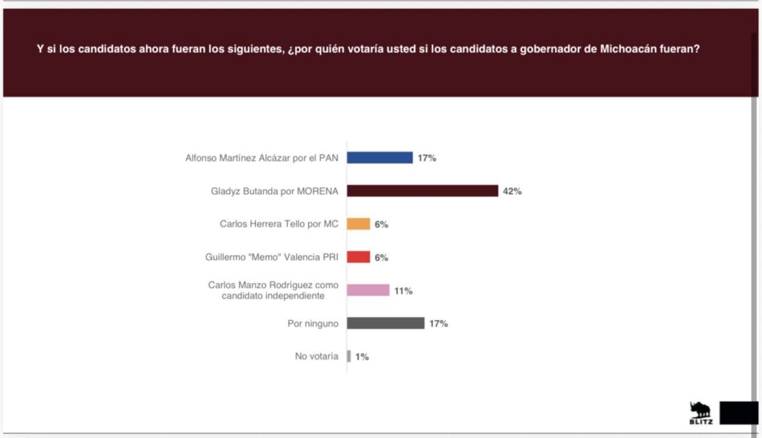 De acuerdo con la encuesta de Blitz levantada en septiembre de 2025, Gladyz Butanda y Carlos Torres Piña encabezan las preferencias internas de Morena rumbo a la gubernatura de Michoacán en 2027.