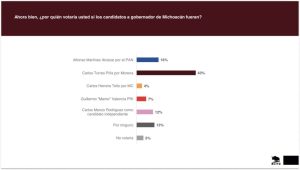 En el caso de la contienda masculina, el actual fiscal estatal y exsecretario de Gobierno obtuvo un 26 % de apoyo, superando al senador Raúl Morón, quien alcanzó apenas un 17 %.