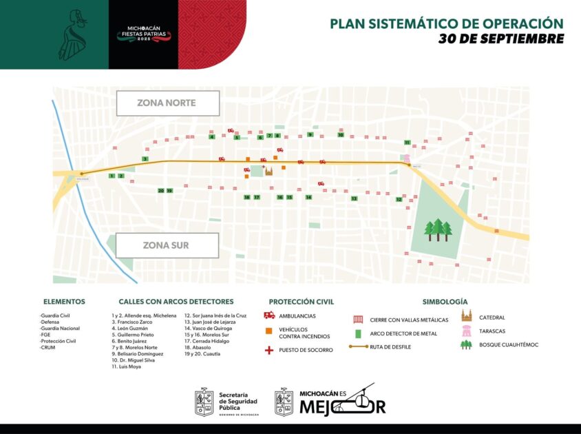 *Morelia, Michoacán, 26 de septiembre de 2025.-* En el marco del 260 Aniversario del Natalicio de José María Morelos y Pavón, la Secretaría de Seguridad Pública (SSP) establecerá un operativo integral de vigilancia, para garantizar el orden durante el desfile cívico militar del 30 de septiembre, con la habilitación de 20 puntos de acceso para el público que asista.